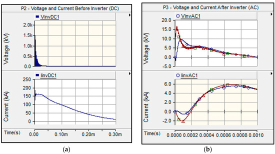 (a) Transient voltage and current at P2 (before inverter PV Array 1); (b) Transient voltage and current at P3 (after inverter PV Array 1).