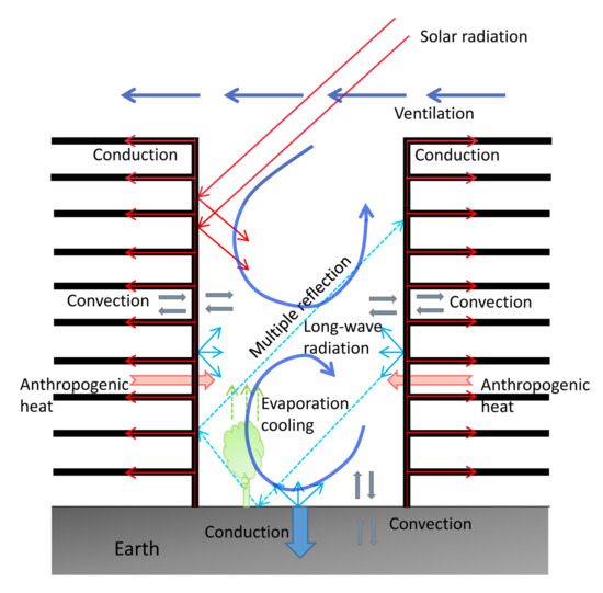 Net radiation is the primary energy source in the urban canopy layer, in which the amount of incoming solar depends on the season, time in the daily cycle, latitude, solar position, and angle. Incoming solar and atmospheric radiation are non-controllable for a specific city from an urban planning and design perspective, while the reflection of short-wave radiation and the thermal emittance of surface material can be manipulated during the design process. For reflected solar, the surface albedo of the building material and urban geometry determines the reflection proportion of incoming solar radiation. The albedo values of building materials vary within a wide range, from 0.05 for dark asphalt (usually used for road paving), through 0.1–0.35 for concrete (usually used for building structure and envelope) to 0.8 for whitewashed roofs [25]. Albedo values for plant coverage over natural surfaces also exhibit variations according to species, sizes and arrangement styles, ranging from 0.07 to 0.3 [25]. It shows that, with the strategic selection of building materials, surface albedo in urban areas may be higher than natural surfaces, reflecting more short-wave radiation. Considering urban geometry, this affects radiation intake in two seemingly contradictory ways [25]: (1) the high variation of building heights leads to lower urban albedo, representing that more radiation is trapped within urban systems through multiple reflections between building facets; (2) increasing building height (deep urban canyon) prevents radiative flux from reaching to the street level. For surface radiation, the energy radiated from a surface itself is mainly decided by the temperature of the surface and its surroundings [26].