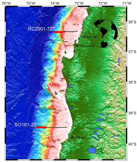 The study area is located in Itata and Valdivia offshores along the Chilean continental slope between 36° S and 40° S (Figure 1), which is characterized by the subduction of the oceanic Nazca Plate below the South American continental plate along the Peru-Chile trench. The rate of subduction is estimated by Ref. [34,35,36], and is of about 66 km·Ma−1.