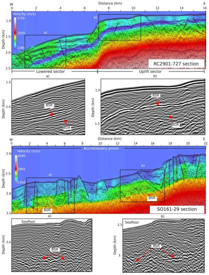 The seismic velocity analysis in both sections indicates strong lateral variations, which is consistent with previous observations (i.e., [17,18,19]). In fact, above the BSR the lowest velocity is observed in correspondence to faults and fractures (SO161-29 section), which may be justified with a porosity variation along accretionary prism [16]. In the northern sector (RC2901-727 section), the seismic character suggests finer grained lithology in correspondence of uplift sector, whereas in the western sector, the stratified sediments may be associated with slide or turbidite deposits (Figure 2, upper panel). This assumption is in correspondence with lithological researches that were performed in the southernmost part by Ref. [48]. Besides, the highest velocity that was calculated in both seismic profiles can be explained by two main factors: (1) the gas hydrate existence; and (2) the change in petro-physical properties as a result of the differential compaction of marine sediments, which can be explained assuming high dewatering is caused due to faults and fractures presence or associated to the uplift [49]. In addition, as reported in literature (i.e., [50,51]), the porosity reduction and the consequent velocity increases can be caused by continental glaciations effects.