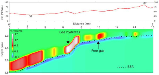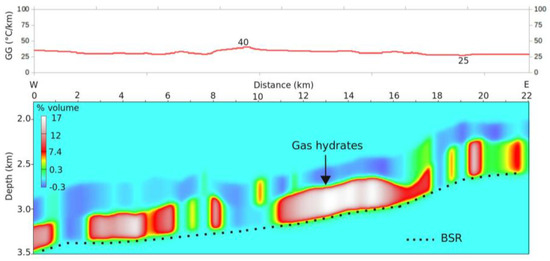 The main indicator of gas hydrate occurrences in seismic sections is the bottom simulating reflector (BSR), which represents the boundary between the high seismic velocity gas hydrate-bearing sediments and the low seismic velocity underlying free gas [9,10].