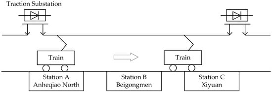 There are some traction substations on one line, and there are some stations in one traction substation. According to the urban subway system, the traction substation of Beijing Subway Line 4 contains three subway stations from Anheqiao North to Xiyuan. Meanwhile, two-side feeding is used, and its voltage is 750 V. The structure of this traction substation system is given in Figure 2 [22]. Station A stands for Anheqiao North, Station B for Beigongmen, and Station C for Xiyuan. Each traction substation contains at most three trains.
