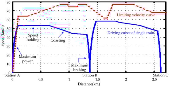 Based on Beijing Subway Line 4, the driving curve is calculated and presented in Figure 3. The single train departs from Station A, travels for 109 s and stops at Station B. Then, it departs again from Station B, travels for 93 s and finally stops at Station C. The horizontal axis is the distance between Station A and Station C, and the vertical axis is the velocity of the single train. The red curve is limiting velocity curve, of which the solid line is the actual limits of velocities, and the dotted line means no limit. The train first runs with maximum traction power, and then holds its speed for a while; after that, the train coasts without traction power; and, finally, the train operates with maximum braking power. The tractive energy consumption, regenerative braking energy, and energy consumption of the single train are calculated and presented in Table 2.