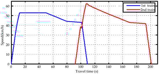 The operation strategy for the two-train system is trying to solve driving curves of two trains and fully use the regenerate energy. The 1st train departs from Station A and travels on its way to Station B, and the 2nd departs from Station A after a certain departure interval. Based on energy-saving operation strategy of two trains in the previous study [17], the 1st train still operates under four-mode operation. For different departure intervals, the 2nd train can adopt two driving modes to minimize the total energy consumption: four-mode operation and five-mode operation. Five-mode operation means that the train runs in five conditions in turn: maximum power, coasting, maximum power, coasting and maximum braking. The 2nd train operates under four-mode operation when its departure interval is close to or after the switching point that the 1st train starts to brake. The 2nd train operates under five-mode operation when its departure is before the 1st train braking switching point. The first coasting condition for the 2nd train is added to make the second maximum power condition overlap with the maximum braking condition of the 1st train to entirely use the regenerated energy. An example based on Beijing Subway Line 4 is presented, and the energy-saving operation curves for two trains are calculated and shown in Figure 4. The departure interval of the 2nd train is 92 s. The horizontal axis is the time of the train, and the vertical axis represents the speed.