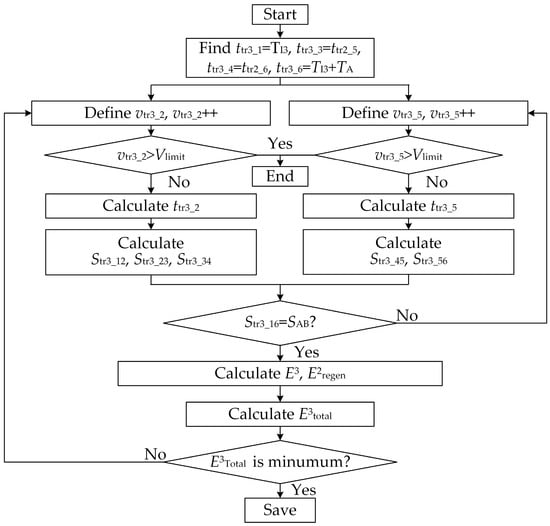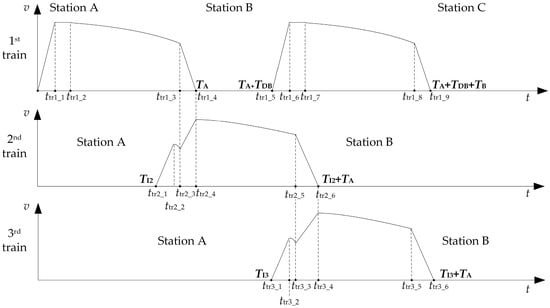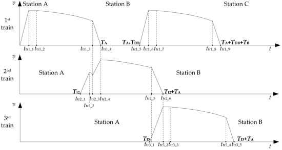 The driving curves for the multi-train system when the 3rd train operates under four-mode operation are presented in Figure 5. ttrm_k is the kth switching point for train m. TA is the travel time from Station A to Station B, and TB is the travel time from Station B to Station C. TDB is the dwell time of Station B. TI2 is the departure interval for the 2nd train, and TI3 is the departure interval for the 3rd train. If the departure interval for the 3rd train ttr3_1(TI3) is little before ttr2_5 and enables the 3rd train to accelerate with the regenerate energy from the 2nd train, four-mode operation is suitable for the 3rd train. In addition, if the departure interval for the 3rd train ttr3_1(TI3) is after ttr2_5, four-mode operation is also suitable for the 3rd train, and the 3rd train can use the regenerated energy as much as possible.