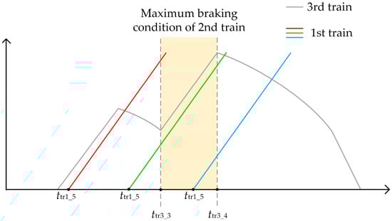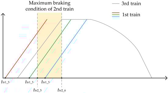 If departure interval for the 3rd train ttr3_1(TI3) is far before ttr2_5, as shown in Figure 6, the 3rd train can operate in coasting condition for a while to make the second maximum power condition overlap with the braking condition for the 2nd train. Thus, the 3rd train operates under five modes (maximum power, coasting, maximum power, coasting and maximum braking) during the trip. For this circumstance, five-mode operation is suitable for the 3rd train. After starts at ttr3_1, the 3rd train coasts from ttr3_2 to ttr3_3, and traction from ttr3_3(ttr2_5) to ttr3_4(ttr2_6).