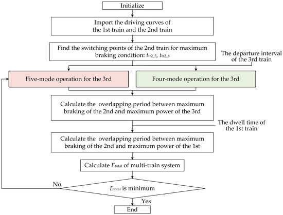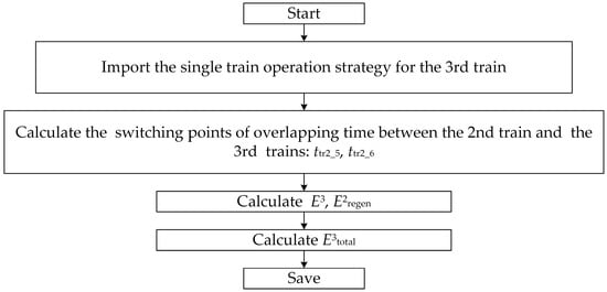 Although the operation modes of the 3rd train can be chosen based on the departure interval, it cannot be determined directly. The computing method is needed to calculate energy consumption under both operation modes to determine which one is optimum. The computing method for the energy-saving operation strategy is to find the best driving mode and driving curves for the multi-train system. Based on the heuristic algorithm and the energy-saving operation strategy for the two-train system, the whole algorithm of the proposed computing method is described in Figure 9.