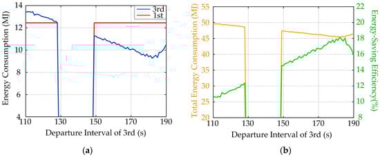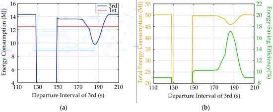 Results of energy consumption for the 1st train and the 3rd train are shown in Figure 15a. The relationship between total energy consumption and the departure intervals of the 3rd train in traction substation is presented in Figure 15b. The relationship between the energy-saving efficiency and the departure intervals of the 3rd train is also illustrated in the same figure. During 129 to 148 s, the 3rd train does not depart to avoid peak power problem when the 1st train starts, as shown in Figure 15. Hence, there is no energy consumption of the 3rd train.