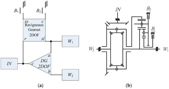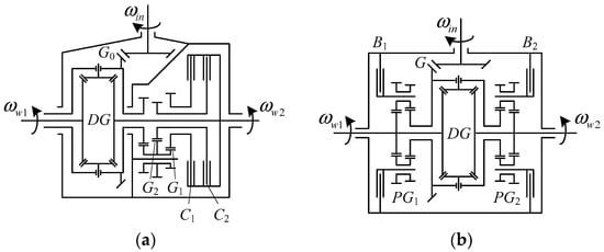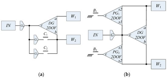 Two current TVD designs are under investigation in this section to understand the design principles of the systems. The schematic diagrams of the superposition-clutch TVD (SPC-TVD) and the stationary-clutch TVD (STC-TVD) [15] are illustrated in Figure 1, and their system configurations transferred by means of a function power graph (FPG) [16] are shown in Figure 2. In Figure 1 and Figure 2, DG denotes the differential gearset; W1 and W2 are the left and right wheels; C1 and C2 are clutches; B1 and B2 are brakes; G, G0, G1 and G2 are gear pairs; PG1 and PG2 are planetary gearsets; IN is the input of the engine power.