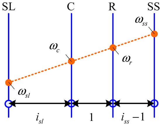 The speed relation between each gear in the Ravigneaux gearset can be visualized in the lever diagram as shown in Figure 4, and can be calculated via Equations (1) and (2) [17,18], in which ωr, ωc, ωsl, and ωss are the rotating speed of the ring gear, carrier, large sun gear, and small sun gear, respectively. iss is the gear ratio between the ring gear and the small sun gear, as presented in Equation (3), and isl is the gear ratio between the ring gear and the large sun gear, as shown in Equation (4), where Zr, Zss and Zsl are the number of teeth on the ring gear, small sun gear, and large sun gear respectively. The constraint of iss and isl is indicated in Equation (5).