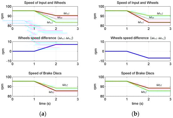 The results of the MATLAB simulation are shown in Figure 5. Figure 5a is the case when B1 is engaged at 1–2 s and B2 is not activated. When B1 is engaging, the wheel speed of W1 becomes faster than W2 and the speed difference constantly increases when B1 is activated. Figure 5b shows the case when B2 is engaged at 1–2 s when B1 is not activated. In this case, an opposite situation happens for the two wheels’ speeds, and W1 becomes slower than W2. According to these results, the proposed Rav-TVD can control the speed ratio between the two wheels symmetrically with different engagement of the brakes, and the design requirement of a TVD mentioned previously is fulfilled.