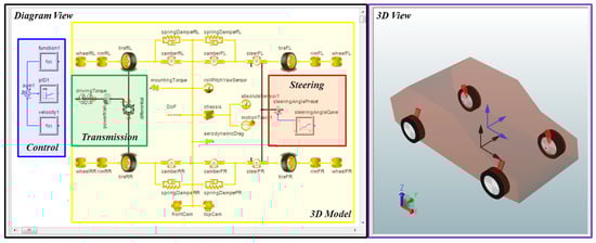 Figure 6 shows the interface of SimulationX and a vehicle dynamic model with a steering control for front wheels, and an OD for rear wheels. In the diagram view of our model, connection lines can be categorized into three types: (a) Signal Blocks (blue lines for control signals), (b) 1D Mechanics (black lines for power transmission), and (c) Multi-Body System Mechanics (yellow lines for 3D vehicle that can be visualized in the 3D view). Due to the convenience of the SimulationX-based model, only the transmission part needs to be altered. For example, a vehicle dynamic model for a SA can be established easily by directly removing the differential element. In this simulation, the vehicle dynamics of the same vehicle equipped with different transmissions (SA, OD, SPC-TVD, and Rav-TVD) are investigated, where the vehicle is assumed be to a rear-wheel-drive vehicle. The simulation scenario is that the vehicle is driven, starting from 0 km/h at −6 s (time = −6 s) at first and accelerated to a constant speed at 60 km/h before 0 s (time < 0 s). Then, a P controller (Proportional controller) is used to maintain the vehicle speed at 60 km/h during the entire process (time > 0 s). More detailed numerical data is shown in Table A1 of Appendix A.