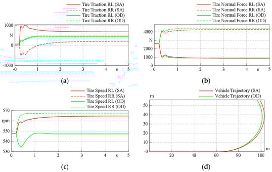The influence to vehicle turning of the solid axle (SA) and OD models, (a) tire traction; (b) tire normal force; (c) tire speed; (d) vehicle trajectory.