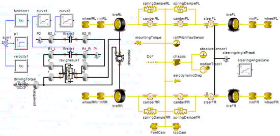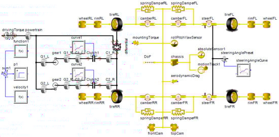 Next, one of the current TVD designs (SPC-TVD) was selected to understand what the torque vectoring effect is and how this effect influences the vehicle while turning. A vehicle dynamic model of the SPC-TVD shown in Figure 8 was transferred from the system configuration of the SPC-TVD shown in Figure 2a, and the only difference compared to the OD model was the transmission as shown in the diagram view. Except for the open differential, two clutches and two pairs of gearsets were added in the SPC-TVD for torque distributions.
