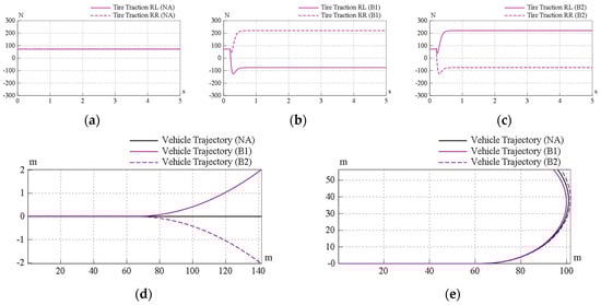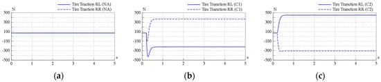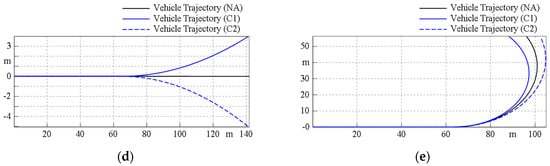 In this simulation, the scenario was similar to the SA and OD models. However, in order to examine the torque vectoring effect, the steering angle was fixed to zero all the time, and three cases were simulated: (a) no actuation (NA) in the SPC-TVD will happen, (b) the clutch C1 will start to be engaged at 0.2 s, and (c) the clutch C2 will start to be engaged at 0.2 s, where the speed of the vehicle is still maintained at 60 km/h over the whole process, and the simulation results including the traction of tires and the trajectory of the vehicle are recorded and illustrated in Figure 9. As shown in the simulated results, there was no turning maneuver observed when no clutch was engaged (Figure 9a). In the case of C1 engaged (Figure 9b), the traction of the inside (rear left) tire was transferred to the outside (rear right) tire, causing a torque moment to the vehicle body, and the vehicle began to turn left. Conversely, in the case of C2 engaged (Figure 9c), a similar phenomenon occurred but in the opposite direction, and the vehicle began to turn right. According to this simulation, the torque vectoring effect of the SPC-TVD was demonstrated, and the effect of the C1 and C2 engagement was shown to be opposite to the vehicle behavior (Figure 9d). Therefore, this effect could also be observed for the vehicle during cornering, while a 5-degree constant steering angle to the left was applied to the front wheels, where the curves of NA, C1, and C2 engaged cases shown in Figure 9e were denoted as neutral-steering (NS), over-steering (OS), and under-steering (US).