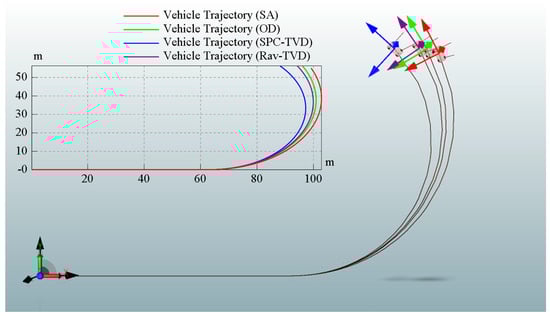 In Figure 10, the Rav-TVD model was also transferred from the system configuration, as shown in Figure 3a, where the transmission was a differential plus one pair of the Ravigneaux gearset with two brakes (B1 and B2). The scenario was the same as in the SPC-TVD simulation, under the same vehicle speed (60 km/h) without steering for the whole process, and the three cases were: (a) no brake in the Rav-TVD will be engaged, (b) the brake B1 will start to be engaged at 0.2 s, and (c) the brake B2 will start to be engaged at 0.2 s. Figure 11 shows the simulated results for the Rav-TVD model that also had the ability to adjust the torque distributions during cornering. Therefore, the vehicle during a NS condition could be shifted to a US or OS condition by generating a torque vectoring effect to conquer or facilitate the steering maneuver. Finally, four vehicle dynamic models (SA, OD, SPC-TVD, and Rav-TVD) were put together for comparison of cornering ability, as shown in Figure 12. All of the vehicles could be observed clearly from the top view of the 3D illustration, and the trajectories showed that the SPC-TVD with the smallest turning radius had the best performance. Although the cornering ability of Rav-TVD was not as good as the SPC-TVD, however, it was still better than the SA and OD.