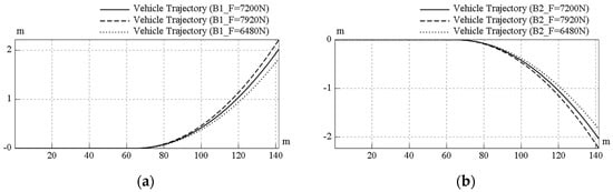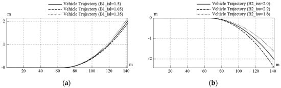 In order to verify the soundness of the simulation model and understand the vehicle performance, numerical simulation with different design parameters were demonstrated. The Rav-TVD model with the original design parameters (Table A1) was selected as a benchmark, and then the simulation results with different design parameter values (gear ratios of the Ravigneaux gearset, Max. press-on force of the brakes, vehicle speed, and steering angle) were adjusted to compare. First, for the gear ratios of the Ravigneaux gearset, the values of isl and iss were changed with a variation (±10%) from the benchmark value 1.5 and 2.0. With the same scenario in previous section (for the case of steering angle = 0 degree), the simulated results are shown in Figure 13. Also, for the Max. press-on force of the brakes B1 and B2, the values were changed with a variation (±10%) from the benchmark value 7200 N, and the simulated results are shown in Figure 14. The results at t = 5 s among these parameters are collected and listed in Table 3, and iss had the largest increment and decrement on the y-direction displacement of the vehicle trajectory. As a result, adjusting the gear ratio of ring gear and small sun gear was the most efficient way to change the torque vectoring effect.
