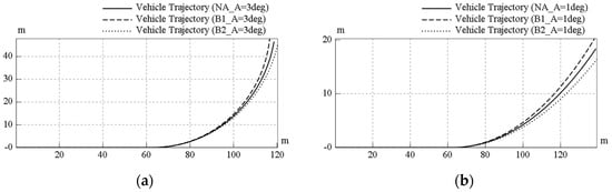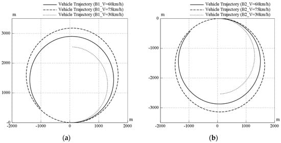In Figure 15, the original vehicle speed (60 km/h) of the Rav-TVD model was changed to 30 km/h and 75 km/h. The simulation time was also extended to 475 s to make sure that the vehicle trajectory was a circular shape after one of the brakes was engaged at t = 0.2 s. This means the Rav-TVD provided the same torque vectoring effect on vehicle to make a turn. The simulated results showed that the radius of curvature of the vehicle trajectory differed from vehicle speed; the higher vehicle speed, the larger the radius of curvature. On the other hand, the parameter of constant steering angle also varied, and the original steering angle (5 degree) is already shown in Figure 11e. Under the same vehicle speed (60 km/h), different steering angles such as 1 degree and 3 degrees were also simulated, and shown in Figure 16a,b. Finally, Table 4 shows the calculated radius of curvatures from the vehicle trajectories for different conditions. In addition, a higher vehicle speed (90 km/h) and a larger steering angle (7 degree) have also been simulated; however, the vehicles flipped and turned over during torque vectoring due to the larger centrifugal force while cornering. Nevertheless, the vehicle dynamics model still had good stability, agility, and safety for most situations.