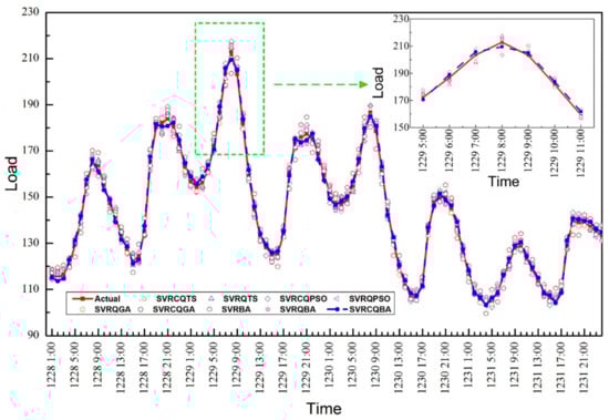 Considering the GEFCOM 2014 load data set is also used for analysis in references [,,], therefore, those proposed models are also employed to compare with the proposed model. These alternative models include, SVRBA, SVRQBA, SVRCQBA, SVRQPSO (SVR with chaotic particle swarm optimization algorithm) [], SVRCQPSO (SVR with chaotic quantum particle swarm optimization algorithm) [], SVRQTS (SVR with quantum tabu search algorithm) [], SVRCQTS (SVR with chaotic quantum tabu search algorithm) [], SVRQGA (SVR with quantum genetic algorithm) [], SVRCQGA (SVR with chaotic quantum genetic algorithm) [].
