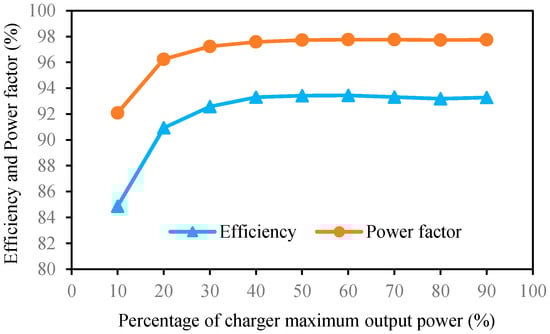 A feature of high-frequency power electronics is that its conversion efficiency deteriorates significantly under lower power operation, due to increased switching loss [32]. Figure 2 is a representative efficiency chart, indicating a sharp drop of charger efficiency when the operating power falls below 30% of the rated power. Figure 2 also indicates that the power factor (real power/apparent power) drops, adversely affecting grid voltage control and VAR compensation.
