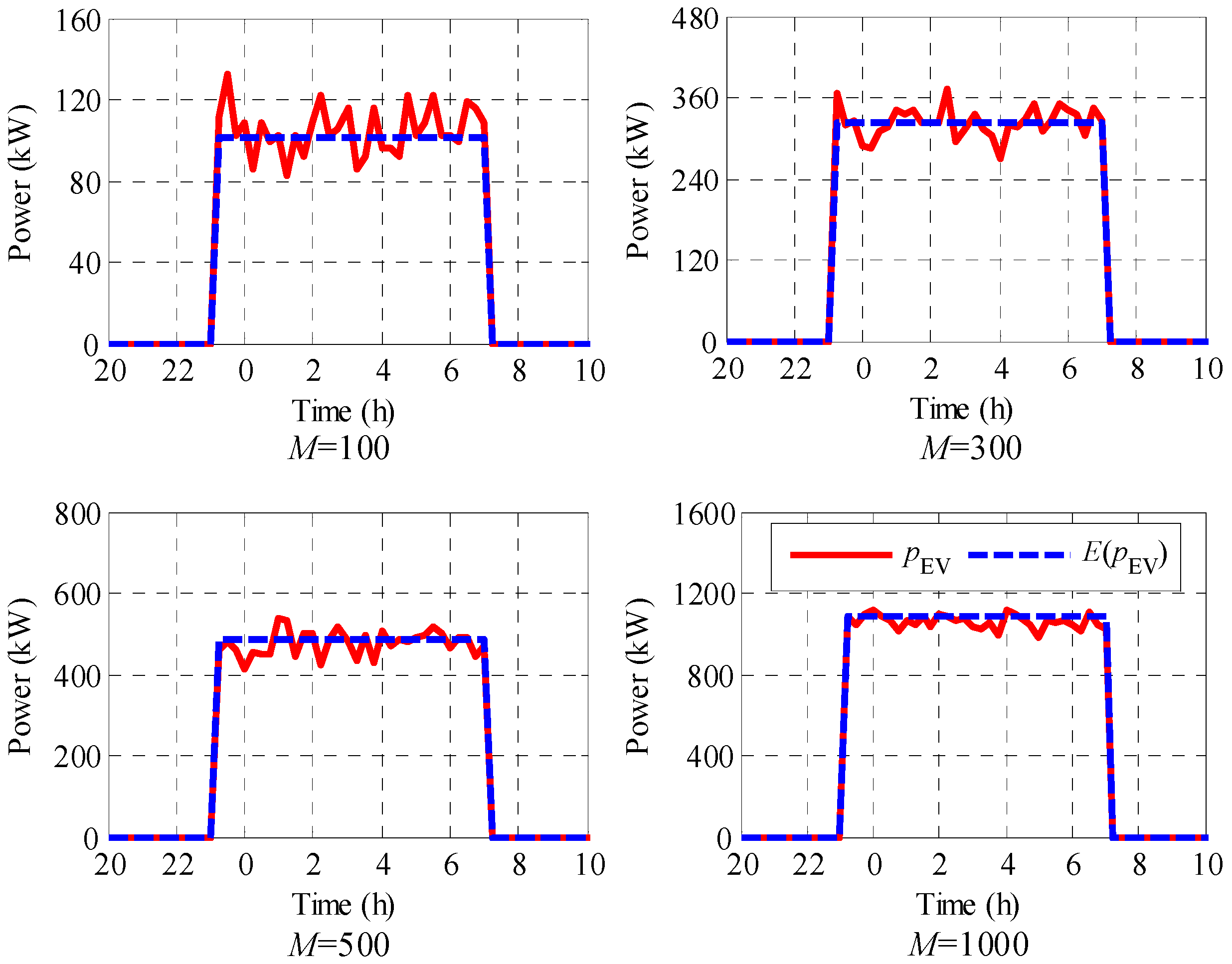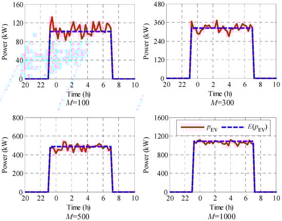 Under the log-normal distribution of Equation (2) with μ D = 3.2 , σ D = 0.88 (daily mileage average e μ D + σ D 2 / 2 = 36.12 miles), and the rated power p max = 3.3 kW , variations of p E V ( k ) and the desired average charging power of all vehicles in the charging duration E ( p E V ) under different M are shown in Figure 3, and its statistics are listed in Table 3.