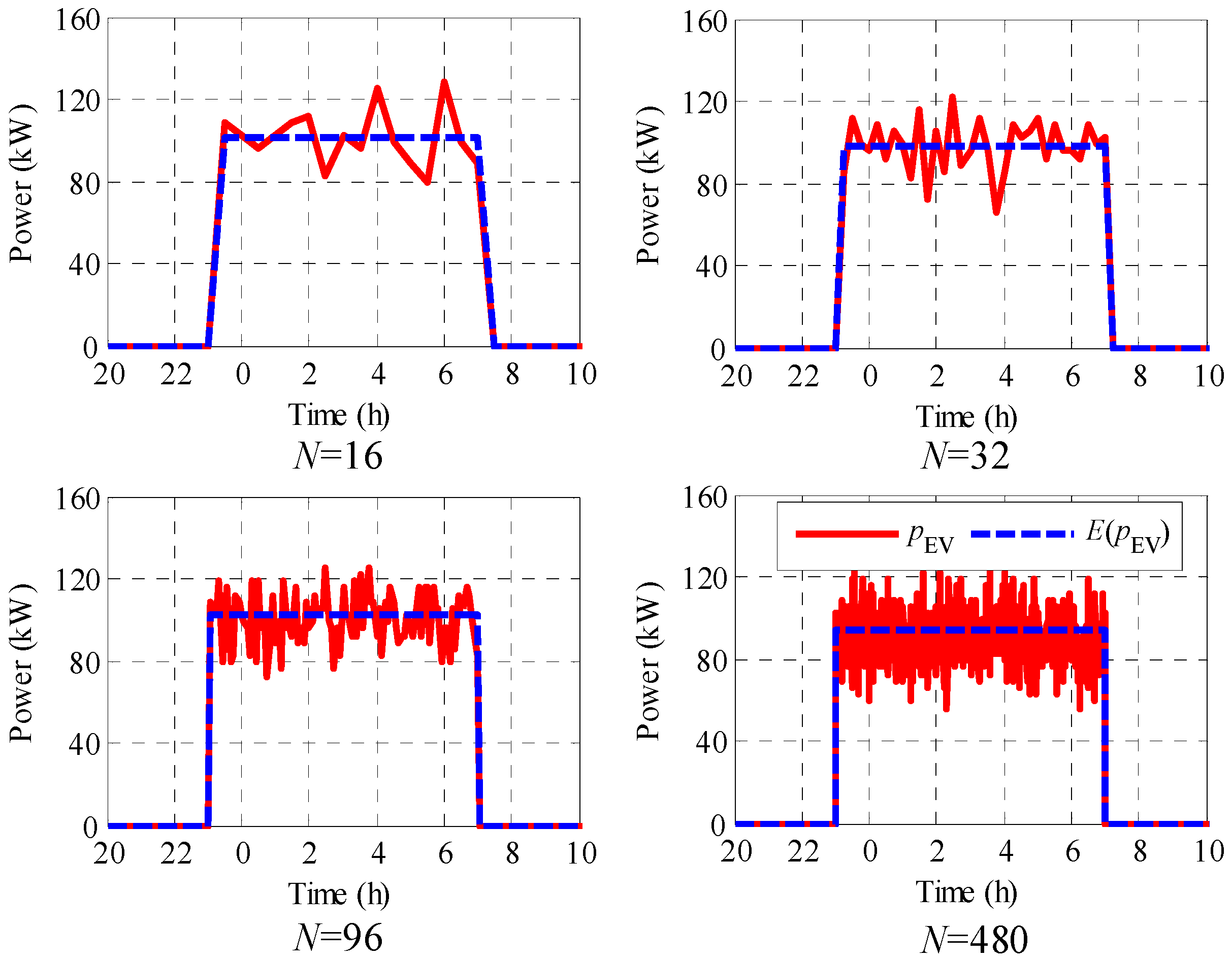 The simulation results show that power fluctuations are smaller for larger EV fleets, which is consistent with the result of Equation (8). However, in practice, the number of EVs within a regional distribution grid is constrained by its power capacity, the parking space, among others, and usually the power capacity is sufficient in the regional distribution grid with a small number of EVs. Algorithm improvements for relatively small fleets will be presented in the Section 4.