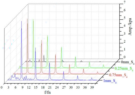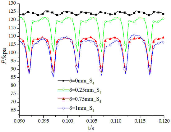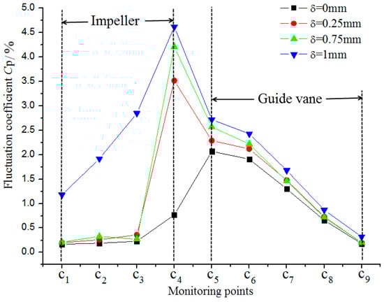 - Due to tip-leakage, flow separation occurs near the shroud, flow separation is stronger and more obvious leakage vortexes form as clearance increases, resulting in stronger pressure fluctuation therein. Meanwhile, when clearance δ = 1.00 mm, pressure fluctuation of point S1 (the central monitoring point on the shroud of the impeller inlet section) suddenly increases, which is closely related to obvious leakage vortexes and a larger low pressure area.