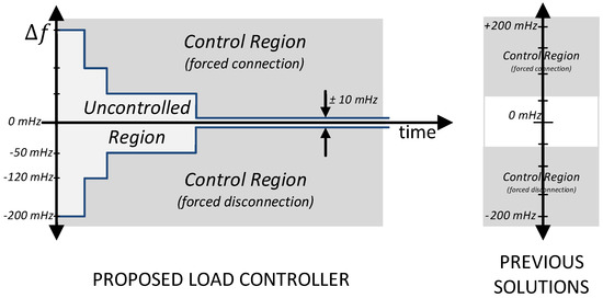 Solutions of customer load control to provide primary frequency response have been discussed during the last few decades. Schweppe et al. originally suggested this idea in 1980 [4], proposing a faster supply-demand balancing by employing “governor-type” action on certain types of loads. A Frequency Adaptive Power Energy Rescheduler (FAPER) is used to assist conventional turbine-governed systems and spinning reserve by switching off, and back on, significant energy consuming loads as a function of its ability to provide energy. An example of such loads would be an electric melt pot in a processing plant or, on a residential scale, an electric heating or hot water system. Oak Ridge National Laboratory (ORNL) conducted research for the U.S. Department of Energy based on the use of controllable loads to increase system security. The proposal is supported by a pager-controlled switch, attached to the consumer appliances, which could be used to provide a load reduction response within a 10-min interval [5]. In the UK, the National Grid company (NG) introduced a methodology for Frequency Response by Demand Management (FCDM), consisting of a commercial frequency response service through the automatic disconnection of agreed large customer loads via low frequency-sensitive relays [6]. The Pacific Northwest National Laboratory (PNNL) developed a device called the “Grid Friendly Controller” that helps the power system be secure and reliable by monitoring extremely low-frequency signatures and turning off certain appliances, such as refrigerators, air-conditioners and heaters [7,8]. Another similar prototype was commercially promoted by Responsive Load Ltd (London, UK). In this case, a frequency-dependent load controller similar to the FAPER is developed by using multiple frequency limits to affect the probability of switching off the controlled loads [9]. Both Comverge (Norcross, GA, USA) and Econnect Ltd (London, UK) proposed intelligent load controllers respectively. Comverge’s “Intelligent Demand” solutions provide cost-effective and efficient means of decreasing the power demand during grid peak periods. Econnect’s devices monitor frequency variations in small power grids with high wind energy penetration using fuzzy logic to switch off (on) resistive loads (such as water heating) in order to maintain the frequency stability [10]. This approach was tested on an island power system with a small number of water heating loads [11,12]. Trudnowski et al. proposed a much more active role for intelligent loads, specifically related to frequency control and dynamic stability. A simple and optimal control strategy is discussed to modulate the customer load as a linear function of the frequency excursions [13]. Short et al. analyzed in [14] how a certain degree of frequency stability could be provided by incorporating dynamic demand controllers into fridges/freezers. These devices monitor the grid frequency and switch off (on) appliances accordingly, while achieving a trade-off between appliance requirements and the grid. The utility of increasing the proportion of such loads in power systems with high wind energy penetration is also discussed. Kondoh et al. also studied the possibility of providing aggregated frequency regulation services with small and deferrable loads, such as electric water heaters and storage systems in [15] and water heaters or air conditioners in [16]. In [17], the Lawrence Berkeley National Laboratory (LBNL) reported the results of a pilot project called “Demand Response Spinning Reserve”. A signal from the central control system is sent by radio signals to the demand side in order to trigger load shedding in real time. This solution provided a high system reliability, a significant rolling blackout prevention and low operating costs. The use of Demand as Frequency Controlled Reserve (DFCR) has been studied in detail, revealing a reliable performance for frequency control purposes. Indeed, this concept of DFCR, which means utilizing electric loads to shift their power consumption in time, is discussed in [18]. Two different types of control logics are proposed, tested on the island of Bornholm (Denmark). Results and conclusions are summarized in [19]. Samarakoon et al. describe a load blocking scheme based on smart meters [20], to provide primary frequency response using local frequency measurements. In [21,22], an experimental rig is developed, using commercially available smart meters and remotely-controlled smart sockets, with the aim of testing and evaluating this load control scheme. Finally, there is widespread interest discovering whether these power loads can actively participate in handling the emergency situations of a power system, such as the frequency stability issue at the second or millisecond level [23].