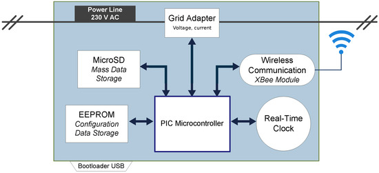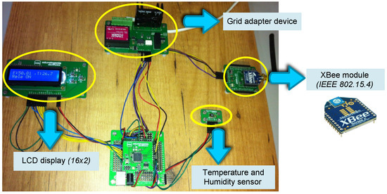 For our purposes, an innovative prototype of sensor/actuator nodes has been developed, based on commercially available Telos-B motes; for the schematic depiction, see Figure 3. A voltage transformer, toroidal MCFM32/12 from Multicomp, is required to obtain conditioned AC signals as suitable Telos-B inputs. Additionally, a Sensirion SHT15 [28] is included to collect environmental variables, such as temperature and humidity data. An actuator consisting of a solid-state relay is able to switch off (on) the individual controlled loads according to the -time characteristic, previously programmed, and the evolution of the estimated grid frequency excursions over time. Sensor/actuator nodes also offer communication via the XBee module, EEPROM for configuration data storage, analog-to-digital converter and PC communication via USB. An LCD display is also available in the prototype, offering data related to the estimated grid frequency, environmental temperature measurements, as well as the relay status. With regard to the sink nodes, they also incorporate MicroSD mass data storage and a real-time clock; see Figure 4. The aforesaid wireless network infrastructure is based on the IEEE 802.15.4 standard for low-rate, Wireless Personal Area Networks (WPANs), operating at 2.4 GHz with a basic bit rate of 250 kbps. Figure 5 shows a general overview of the proposed solution, including sensor nodes and the sink node. To enable configuration and interaction with nodes, two Graphical User Interfaces (GUIs) are provided: the sink node console and the meter node console. Setting up nodes, modifying and verifying configuration data and reading the collected electrical and environmental data stored on the MicroSD are some of the tasks that can be carried out through these interfaces.