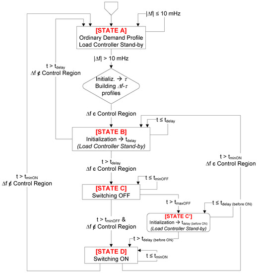 If the frequency deviation remains within a certain threshold for a time interval, the load controller does not provide any forced switching off (on) signal, and the individual load follows its normal operating power demand profile. When the frequency deviation corresponds to the control region (see Figure 1), the node will switch off (on) the individual load through the solid-state relay, thus reducing (increasing) the power demand, respectively. As can be seen from Figure 1, the larger the frequency deviation, the sooner the load controller provides a forced switching off (on) signal. On the contrary, small frequency deviations are allowed for a longer period of time, thus delaying the controller actuation. For a better understanding of the load controller behavior, Figure 6 shows the control scheme for under-frequency events. The scheme comprises four stages: State-A (ordinary demand profile), State-B (waiting time before switching off), State-C (disconnection) and State-D (reconnection).