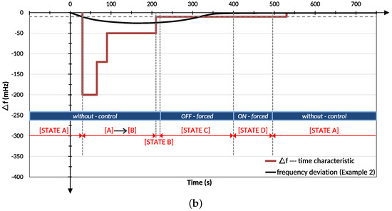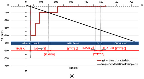 - In Figure 7a, a second off-forced time period is started (State-D → State-B), since the frequency value continues within the control region and does not recover its nominal value. In this case and after the on-forced time interval (State-D) is finished, the load controller changes the status to State-B and back to the beginning of a new off-forced time period process.
