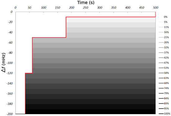 To avoid instantaneous and massive disconnections and, consequently, undesired frequency oscillations, another characteristic (not included in the scheme of Figure 6) is considered in the proposed load controller. Specifically, a Probability Density Function (PDF) has been implemented on each load controller to decide if the individual load will participate (or not) in the demand side response. Therefore, depending on the depth of the frequency excursion, a proportional amount of loads will be called upon to switch off, thus emulating the linear and proportional response of classical turbine-generator governors submitted to under-frequency excursions. On 1 July 2005, the Union for the Coordination of the Transmission of Electricity (UCTE) standards became mandatory through a binding agreement called the Inter-TSOMultilateral Agreement (MLA). According to these UCTE requirements, in case of a quasi-steady-state deviation of the system frequency of ±200 MHz from the nominal frequency, all available primary control reserves are expected to be full [30]. Consequently, the PDF is linearly distributed from the minimum activation control ( = mHz) up to this maximum frequency deviation (= mHz). According to Figure 6, if the time delay before disconnection is exceeded (), each load controller might (or not) reach State-C, depending on the magnitude of the frequency excursion. Loads are then called upon to participate in the frequency control progressively, as shown in Figure 8. For the frequency excursion shown in Figure 7a and according to the percentage of load participation described in Figure 8, around 5% of the controlled load will be called upon to participate in the frequency response. For the second example of under-frequency excursion (see Figure 7b), approximately 20% of the controlled load will be submitted to off-forced time intervals.