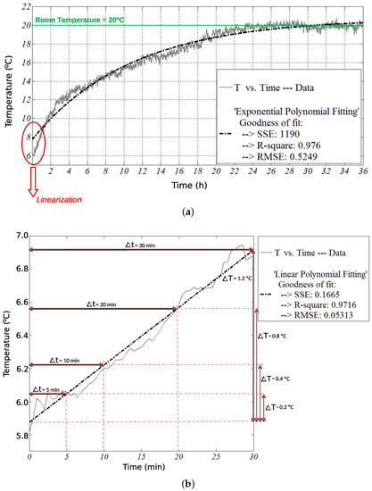 An example of how to set one of these parameters is shown in Figure 9. As can be seen, Figure 9a depicts the temperature profile obtained when a refrigerator is submitted to an off-forced time interval. Thermal processes of objects are often described by Newton’s law of cooling, which states that the rate of temperature of a cooling body with respect to the surroundings decreases exponentially with time [31,32,33]. This statement leads to the classic equation of exponential decline over time, i.e., , which can be applied to the aforementioned refrigerator’s disconnection. Thus, temperature data are presumably best interpolated using an exponential fit, with a R-square of 0.9716. As shown in this figure, in a 36-h interval, the temperature reaches room temperature. For our purposes, only the first 30-min interval of the entire period is needed; see Figure 9b. Within this time interval, a linearization is suitable to adjust the temperature data to a linear polynomial fit, i.e., . By observing the evolution of the temperature in Figure 9b, the maximum disconnection time () as a function of the maximum allowable temperature rise can be easily determined. For example, an off-forced time interval of 5 min implies a maximum expected temperature increase of around 0.2 °C.