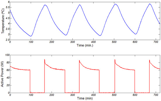 Initially and with the aim of characterizing temperature and power demand profiles under normal operating conditions, a preliminary study has been carried out using current domestic fridge/freezer appliances. Detailed measurements of internal temperature, voltage and current data have been collected using the corresponding sensors and a data-logging software. In this study, four cycles at 50 Hz with a sampling frequency of 6.4 kHz were gathered every 30 s (512 sets of data every 30 s). The collected data under normal conditions for a 12-h time period are summarized in Figure 10. As can be seen, the fridge/freezer remains switched on around 1 h and 40 min every 3 h. Subsequently, the duty cycle, the percentage of time that an entity takes in an active state as a fraction of the total time under consideration [34], can be initially estimated around 55%, although this value can be modified according to the selected temperature set-point. Operating characteristics for the different fridge/freezer groups are summarized in Table 1.