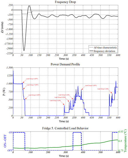 In reference to Case Study (I) (see Figure 11), a frequency drop of such magnitude, if not corrected, could trigger the system-wide load shedding [20]. Electrical and thermal variables for this frequency excursion were collected, and the laboratory test results are shown in Figure 11. The UCTE sets that the entire primary control reserve must be automatically and fully activated in response to quasi-steady-state frequency deviations of ±200 MHz [38]. Consequently, all load controllers must switch off the individual loads when the grid frequency excursion () is −2115 MHz. A delay time interval randomly assigned on each individual load controller is included to avoid synchronous responses (), and thus, loads must theoretically remain off until the grid frequency is reestablished. According to the minimum comfort levels and/or temperature constraints required by the customers, the disconnection time period is limited by a predefined maximum time period ( min). For this reason, and even under frequency drop situations, loads are forced to switch on in order to avoid temperature excursions higher than the allowed limits. As an example, Load Group 5 is switched-on at 350 s, in spite of the frequency excursion remains within. A random time delay is also considered on each node to mitigate the simultaneous load re-connection process. If a relevant number of individual loads is submitted to off-forced time intervals under grid frequency excursions, these delay time intervals for connection and disconnection processes are randomly distributed to avoid significant power demand oscillations with their corresponding impact on the grid frequency evolution.