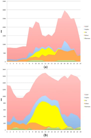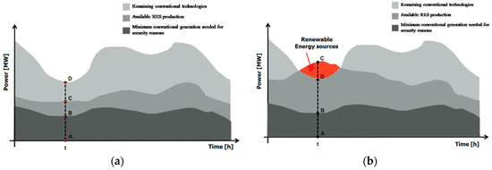 (a) Load profile and generation distribution in case of “normal” operation; (b) Load profile and generation distribution with RES curtailment requirements [28].
