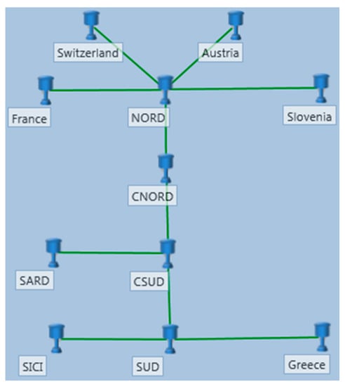 The network topology is identified in PLEXOS by defining regions, nodes, and lines. The regions are the main transmission areas. They define the system control areas and can be associated with load values for the area they represent and to reserve requirements. They can contain one or more nodes. Nodes represent transmission buses, i.e., single network elements, connected one to the other by means of transmission lines. They are associated with the generators contained in the area they embody and to the load expected for that area. The model developed for this study considers a simplified version of the network, with the attention focused on inter-zonal power exchanges and not on local network configuration. According to this choice, the regions and nodes defined are the ones shown in Figure 3.