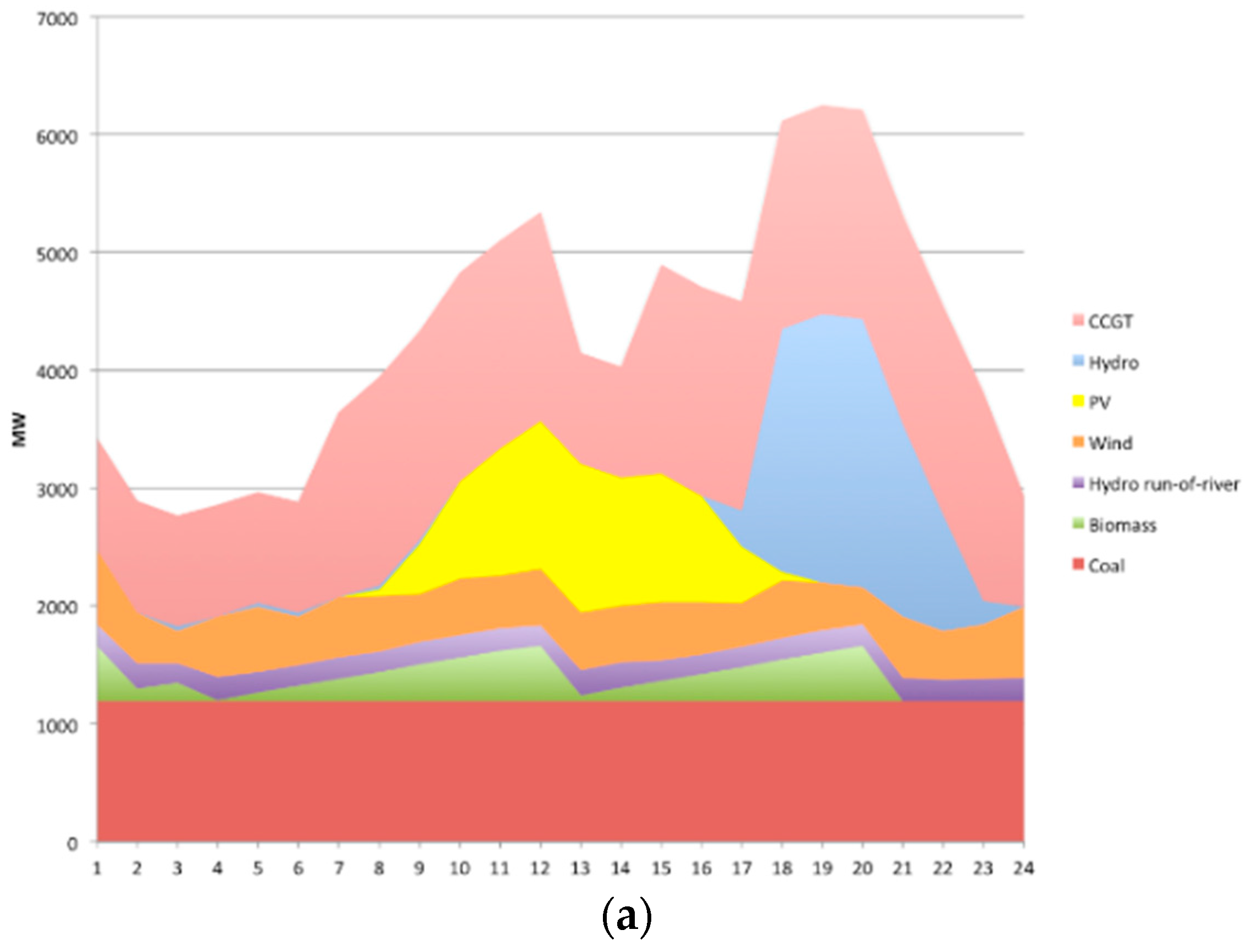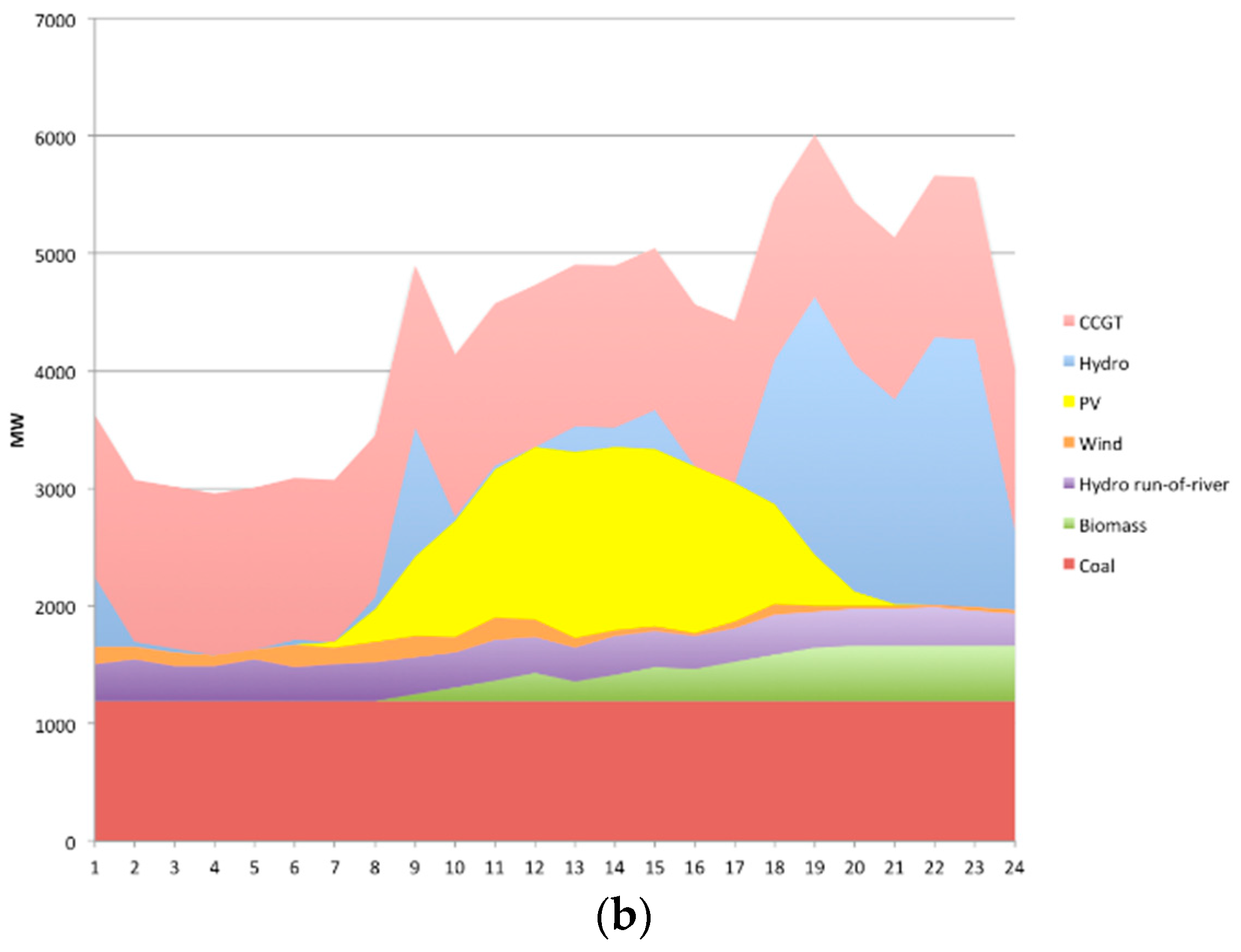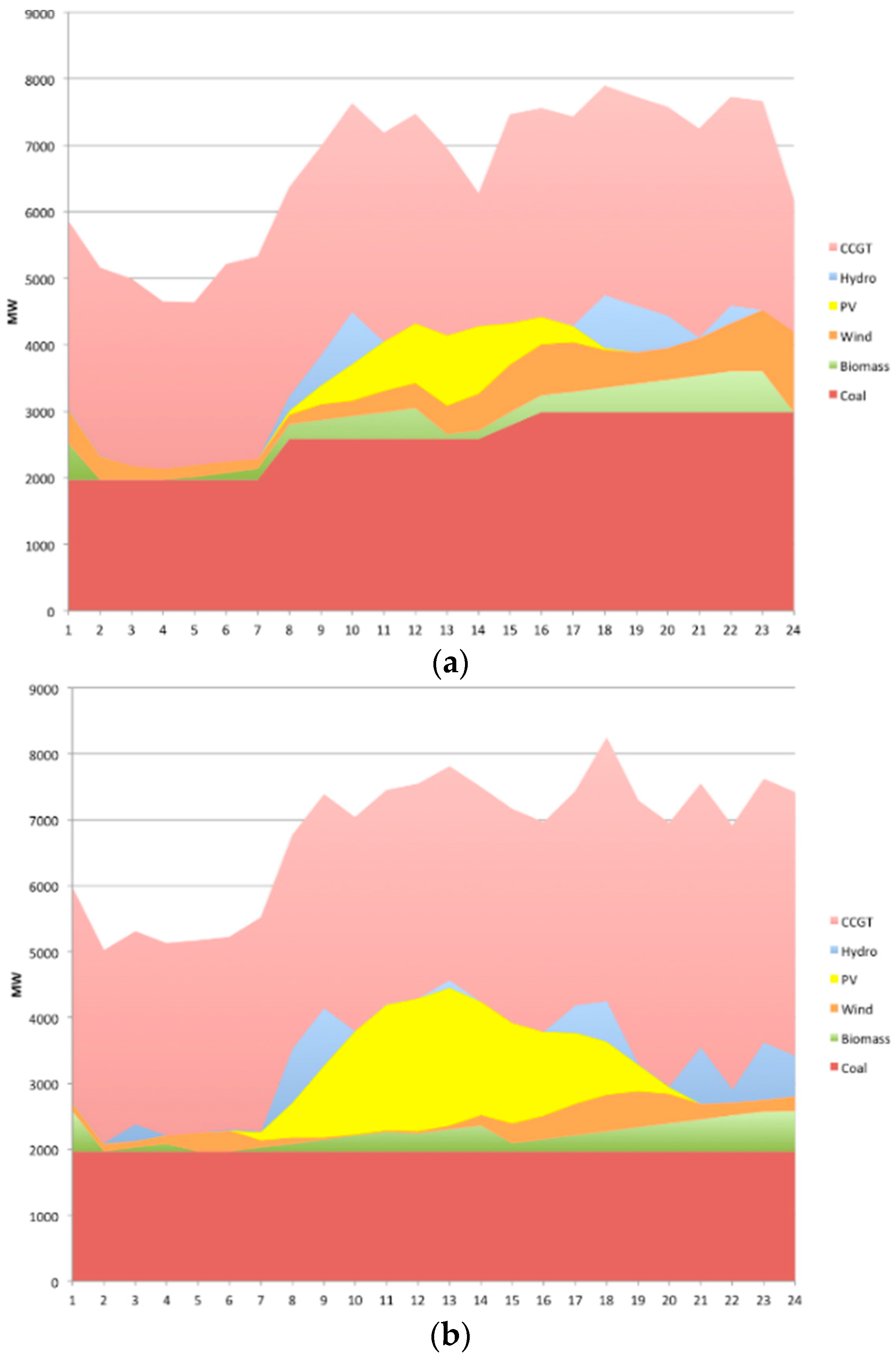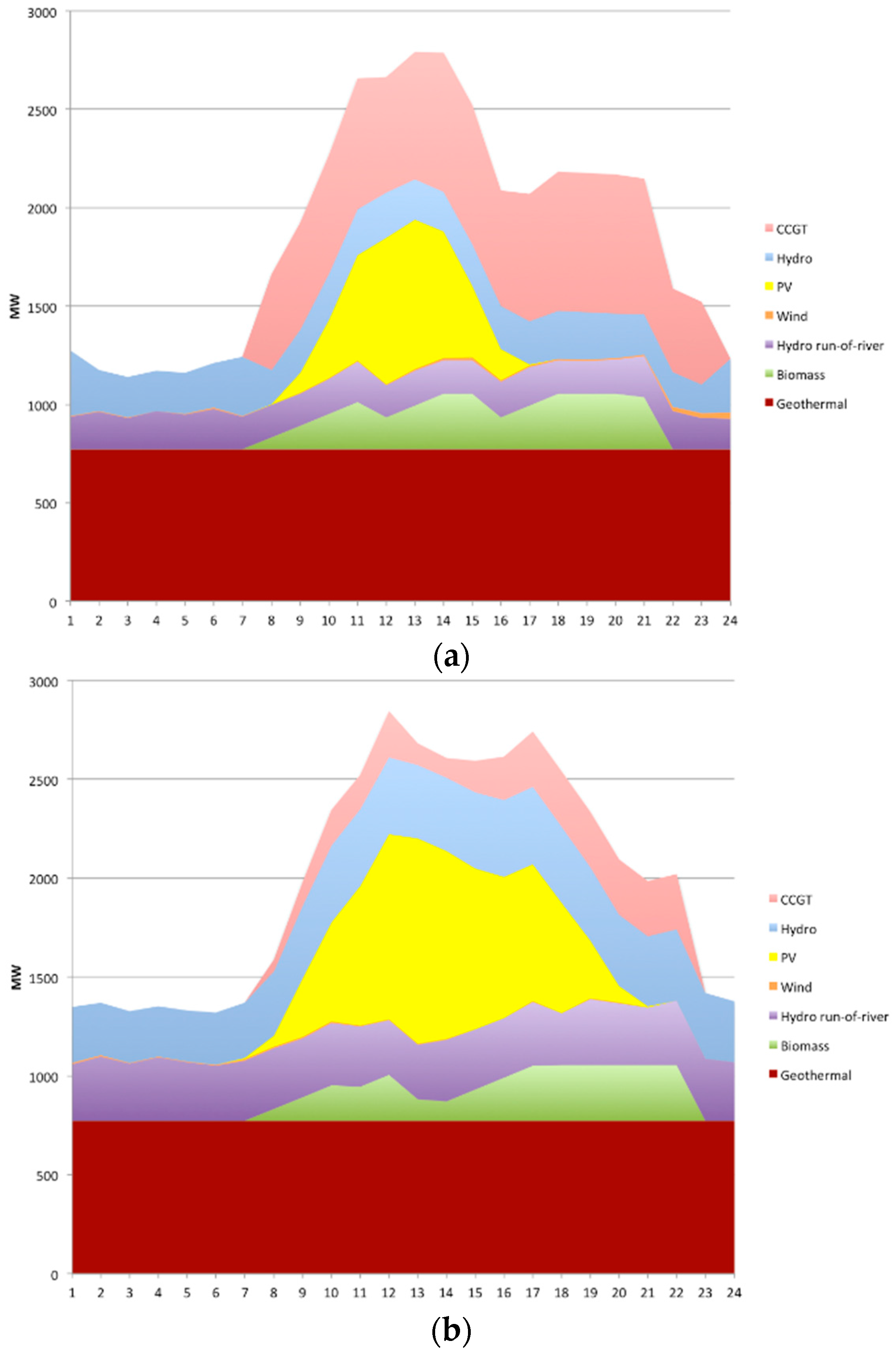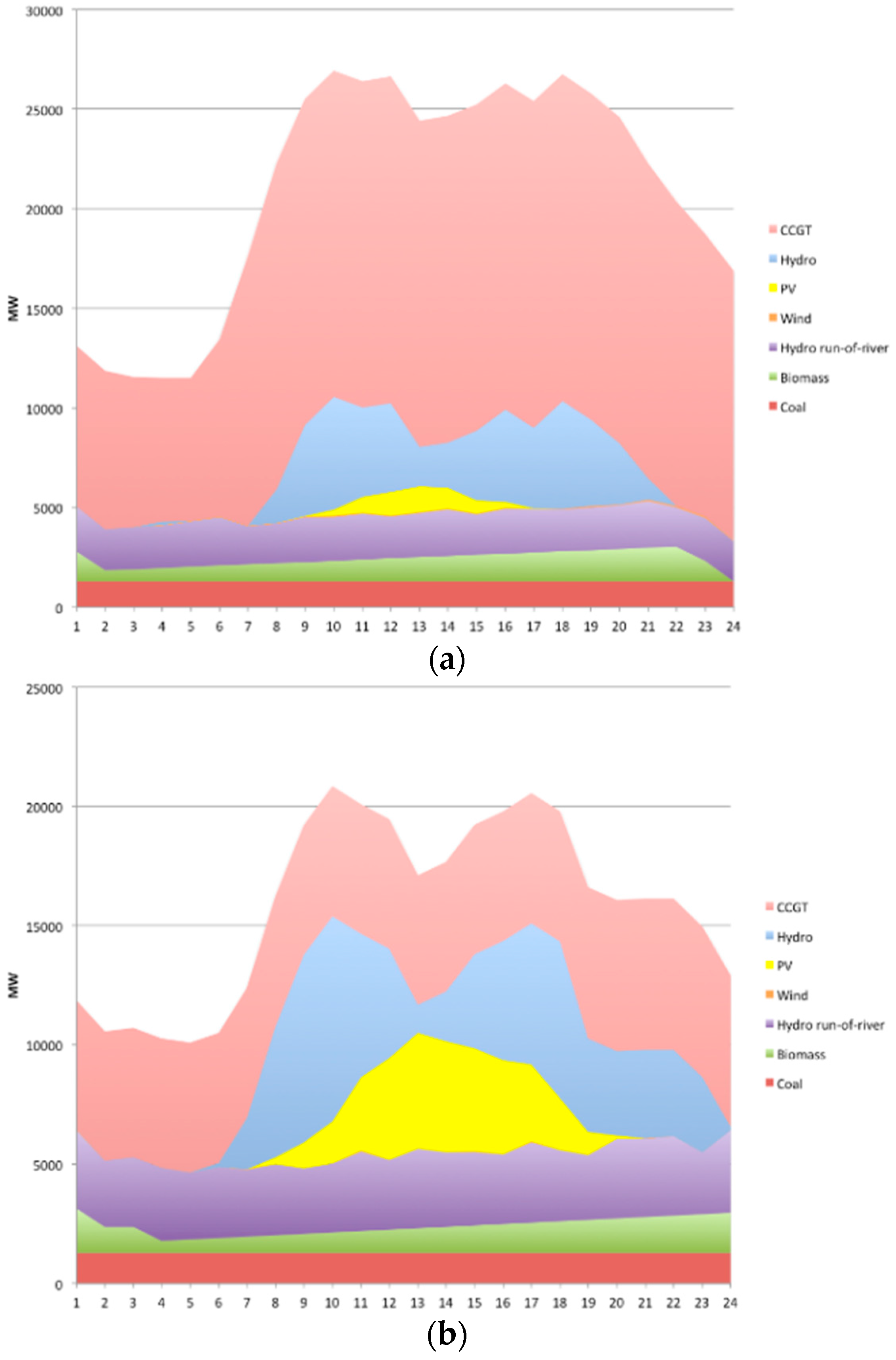 Figure 5. Generation profile—CNORD (a) winter and (b) summer.