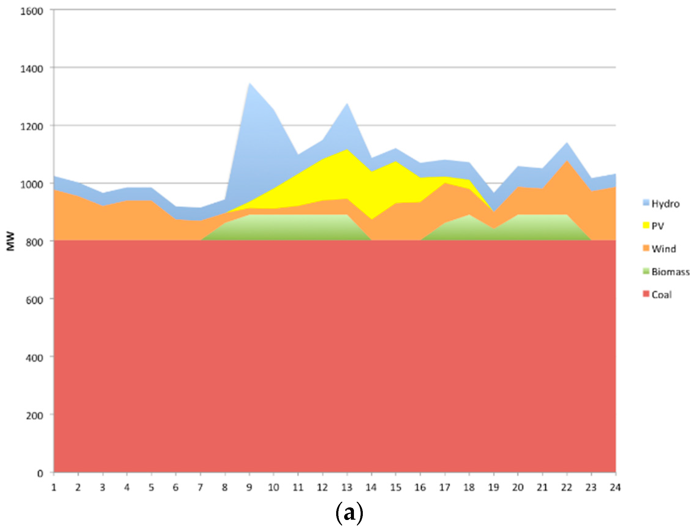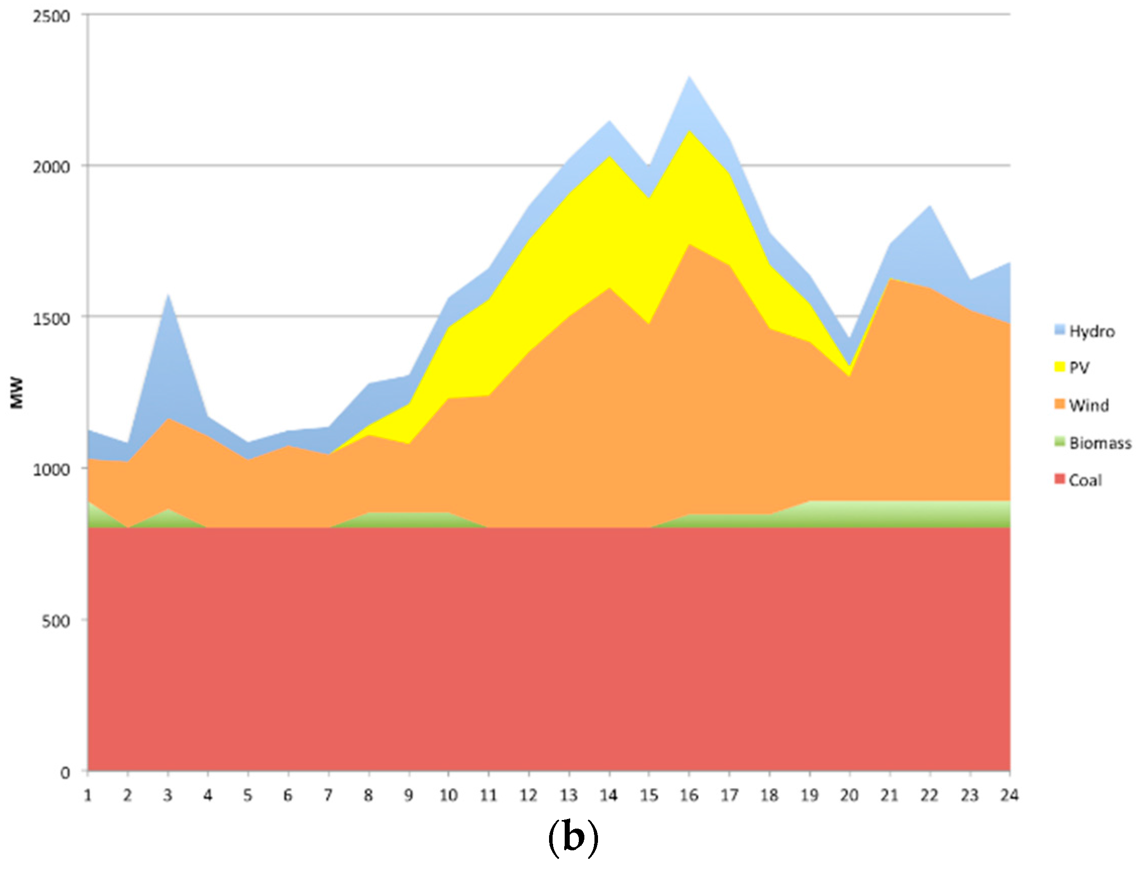 Figure 1. (a) Load profile and generation distribution in case of “normal” operation; (b) Load profile and generation distribution with RES curtailment requirements [28].