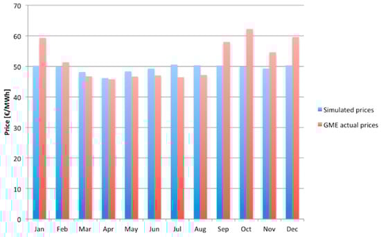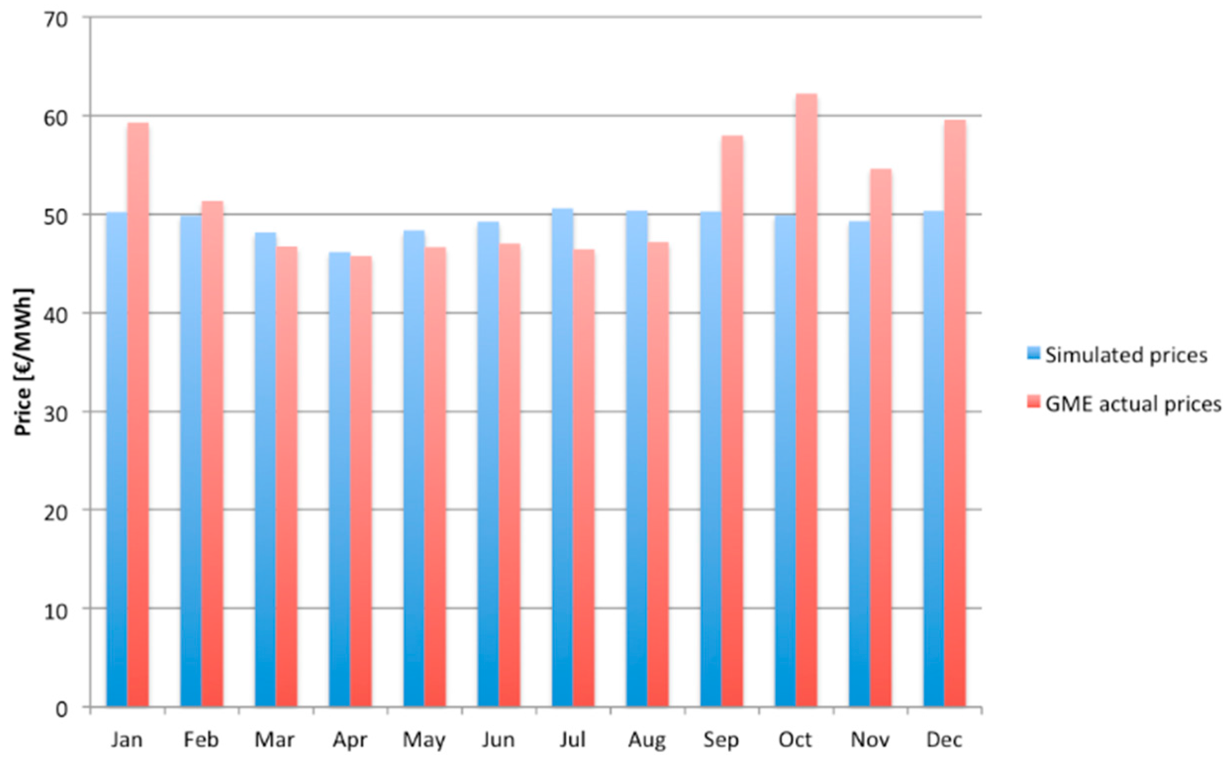 Figure 7 shows an example of correlation between the load curve and the price profile throughout one day (in particular, it refers to node SUD in January). The presence of high PV penetration might distort this correlation, since a high amount of "free" generation during peak hours (around midday) tends to bring down the price of electricity on the market. Figure 10 compares actual and simulated data on a monthly basis.