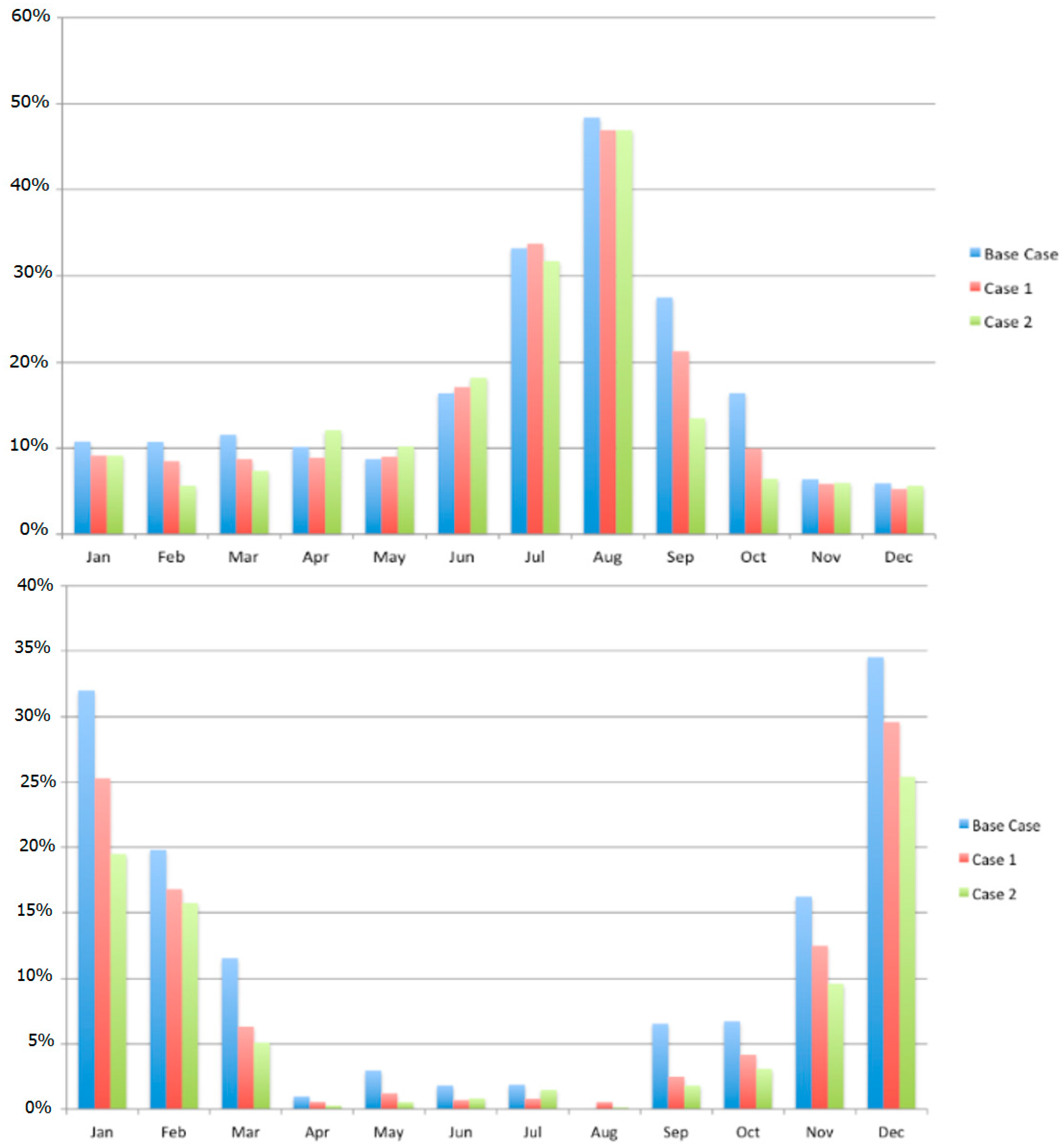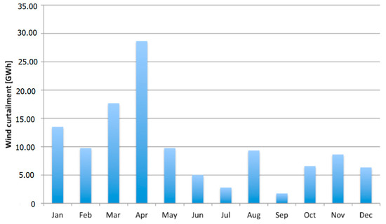 The total amount of wind generation curtailed over the simulation year adds up to 119.8 GWh. This represents the 0.92% of annual electricity generation from wind resources. Wind curtailment amounted to 248 GWh in 2013, corresponding to 1.8% of that year’s generation. Figure 10 includes both curtailments due to stability issues and those made necessary by local transmission constraints. Only the former are included in the simulation accounting for 51% of wind curtailment in 2013. It can be observed, indeed, that the value of total wind curtailment resulting from the simulation is consistent with the expected one, with variations attributable to different wind availability and load patterns in 2014. Figure 11 shows the occurrence of wind curtailment on a monthly basis throughout the year.