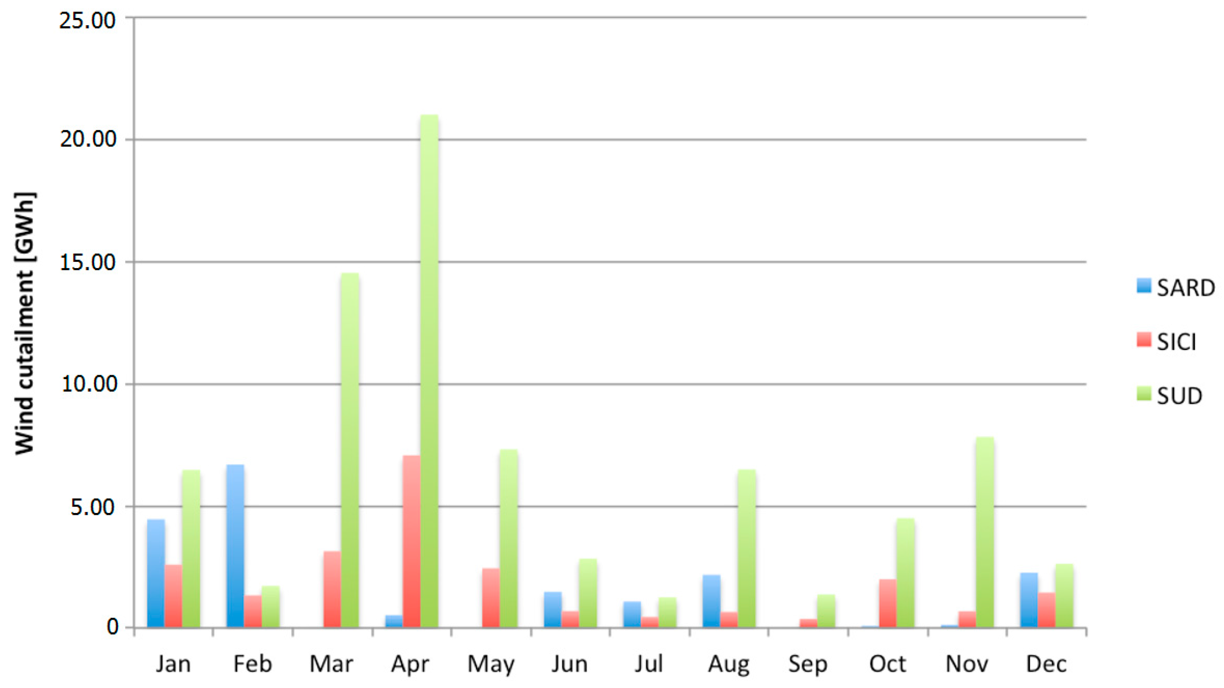 Most wind curtailment occurs in the SUD zone, where the majority of wind capacity is concentrated. Here, wind curtailment amounts to 78 GWh in one year. The islands (Sicily and Sardinia) are also characterized by significant curtailment events, due to their large RES penetrations, the limited exchange possibilities, and the higher need for reserves and synchronous generation. Wind curtailment data for Sicily and Sardinia, resulting from the simulation, total 23 and 19 GWh, respectively. Figure 12 shows the monthly distribution of wind curtailment in the three zones: SUD, SICI, and SARD.