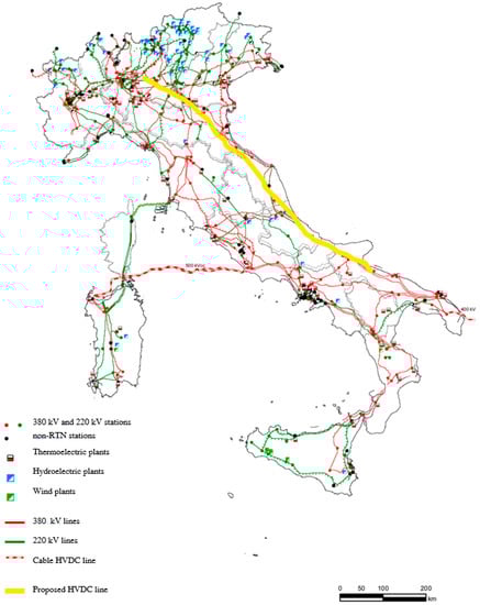 An option has been here studied in detail for the Italian case. This consists of creating a HVDC connection between Southern Italy (where most of the renewable production is concentrated) and Northern Italy (where the biggest load centers are located). The line should cover roughly 800 km and would shift large amounts of wind generation where it can be consumed, avoiding it being curtailed when the load in the South is low. Direct Current is chosen because the long distance involved makes it more economical and more efficient compared to an AC connection. Moreover, a DC link is more controllable and it avoids the propagation of disturbances. Finally, it can connect systems that are (even temporarily) at different frequencies or phases. All these characteristics enable it to be used securely and effectively in a network with large penetrations of variable RES, which decrease the inertia of the system and tend to increase grid disturbances. Similar solutions have been proposed in other works to mitigate problems of renewable sources curtailment [41].