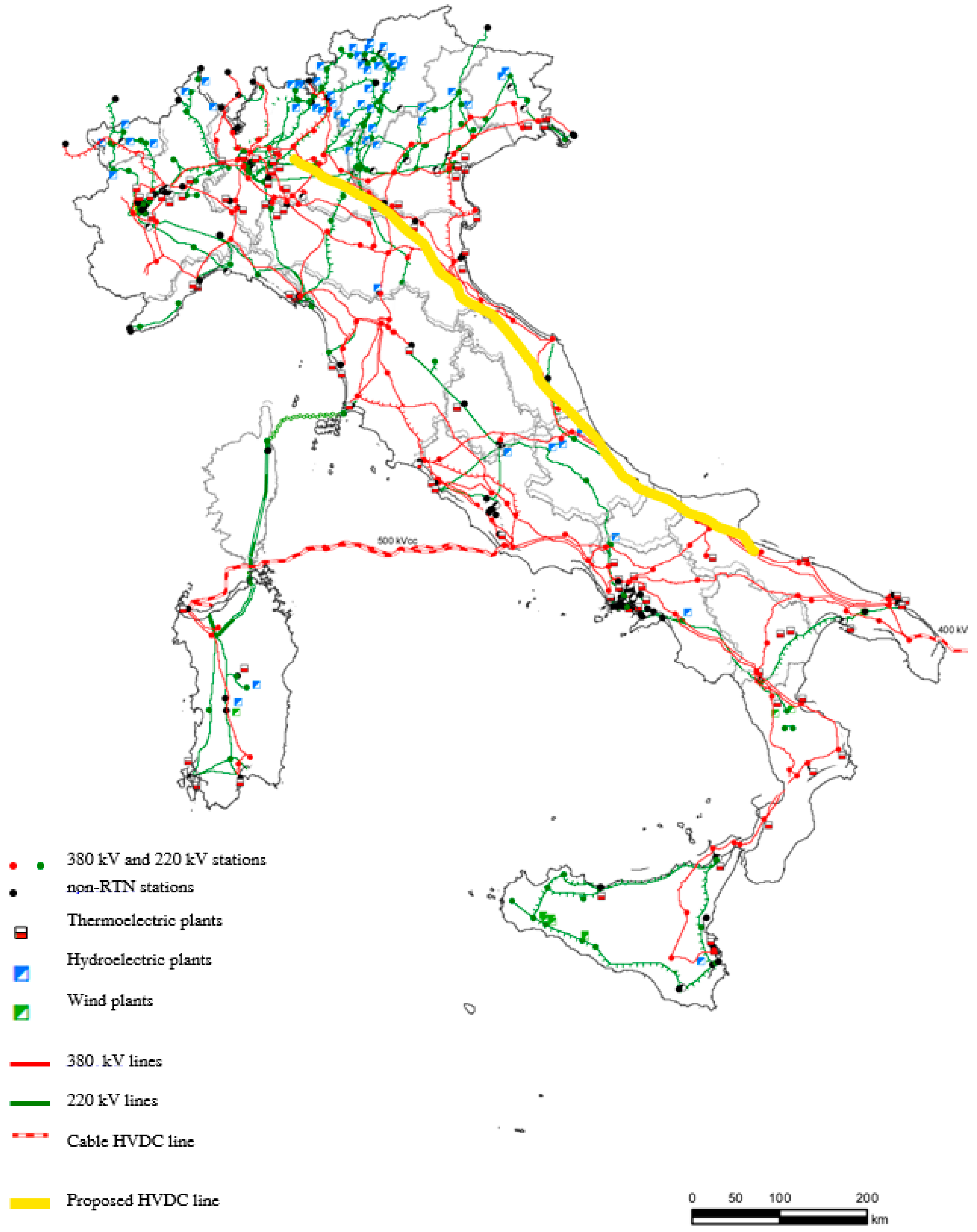 The related connection should be able to transport rather high amounts of power for a long distance (about 800 km). In order to limit the losses, which over such a distance would be too high in AC, a HVDC line is here considered as the best alternative. A HVDC link also has the advantage of being an asynchronous system. This allows it to be interconnected with systems having different frequency or phase. This is the case for Northern African countries, which might represent an interesting power exchange node in the future. In particular, the association of Mediterranean TSOs (Med-TSO) is working towards market integration and a common development of the Mediterranean countries’ power systems, by means of new interconnections that might see Italy as a strategic interface. The distance to be covered by the proposed HVDC corridor amounts to roughly 800 km. Figure 13 shows the hypothetical path covered by the proposed HVDC line.