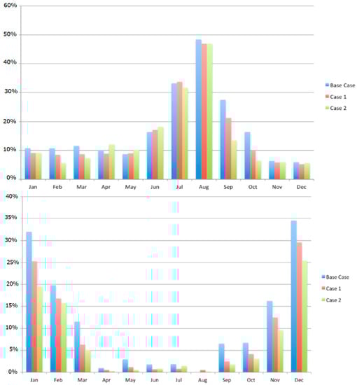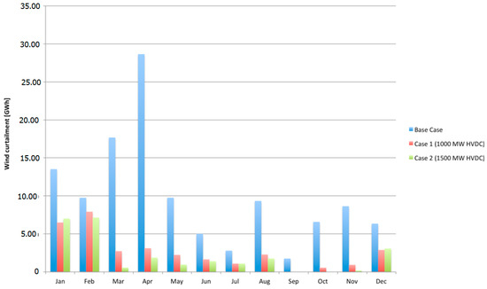 As concerns the proposed HVDC line, it also experiences major congestion problems. Indeed, its capacity is fully exploited in both its directions for many hours per year. The total amount of hours in which the HVDC line results in congestion over the simulated year is for Case 1 equal to 6607 h and Case 2 equal to 5643 h. As expected, the larger power rating involved in Case 2 reduces the congestion phenomenon along the line. It can be observed that they are rather high, hinting that the transmission would benefit from a larger rating of the line. Indeed, the flow is heavily limited by the connection capacity chosen and an increase of the latter would certainly lead to greater exchange flows between the two nodes. However, since huge reductions in wind curtailment are already realized with the ratings considered in Case 1 and 2, the marginal improvement achievable with an increase of line capacity is expected to be very low; on the other hand, an expansion of power capacity would lead to higher capital costs, whose increase is not justified by the limited benefits in wind curtailment reduction.
