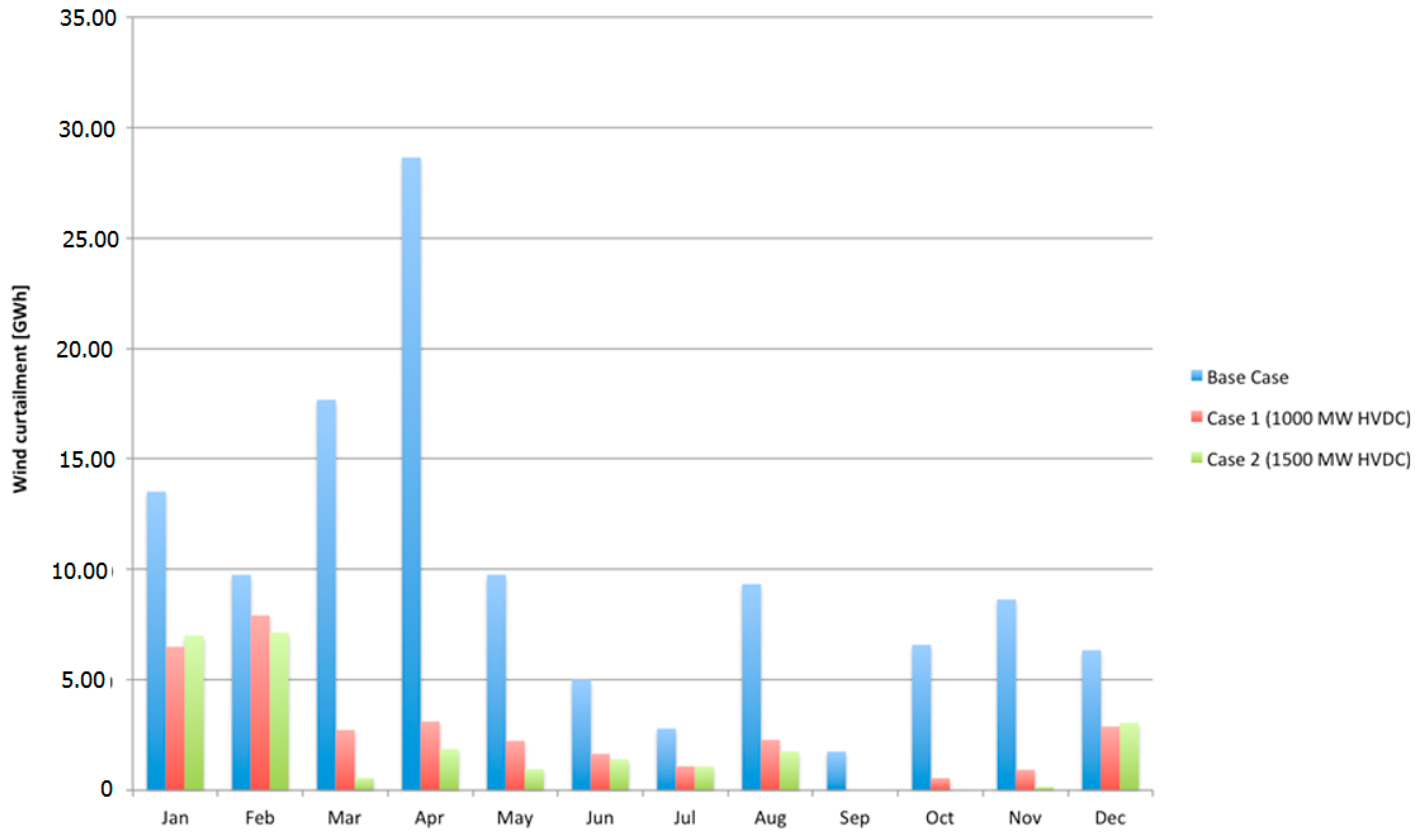 The application of such a connection, according to the simulation performed, leads to wind curtailment reductions of the order of 73.4% and 79.1%, respectively in Case 1 and 2, with respect to the current levels. This would lead to very marginal values of wind curtailment overall in Italy. The reduction is mainly registered in Southern Italy and partially in Sicily. Despite the long payback times involved in such a project (estimated around 26 and 31 years, respectively), the great wind curtailment reductions determined make the implementation of an HVDC connection very interesting. Indeed, this would imply first of all the capability to more easily and efficiently integrate renewable energy sources, which are bound to increase further in the coming years. Moreover, it would allow a better control of power flows on the network and a more secure operation thanks to limited disturbances propagation.