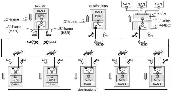 The basic topology, a ring, uses two independent paths (clockwise and counterclockwise) as depicted in Figure 2. Double Attached Nodes (DANs) forward frames from one port to the other, unless they are the sole destination of the frame, or unless they have already sent the same frame in the same direction. HSR networks do not accept Single Attached Nodes (SANs) connected directly because they cannot forward frames; therefore, Redundancy Boxes (RedBoxes) become necessary. A RedBox is a three input switch, two of the ports are connected to the HSR ring while the third (called interlink) is connected to a standard Ethernet network. A key point in this kind of networks is that every node must eliminate duplicate and circulating frames. A duplicate is a frame that has already been received through a port in the destination node, while a circulating frame is one that has already been sent through a port and should not be sent again uncontrolled (for example, in a single ring, because it has lost its origin -multicast-, or origin and destination -unicast-).