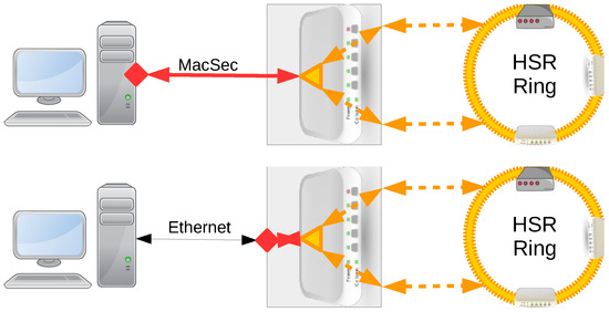 The disadvantages are also clear. The use of legacy HSR switches, RedBoxes or DANs is prevented since they cannot understand the MACsec header. HSR switching requires MACsec processing, which will add latency as described in Section 4. For example, as can be seen in Table 2, the maximum number of elements can be halved.