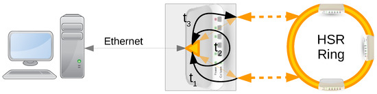 The maximum number of nodes, N, of a HSR ring is given by Equation (3) in this theoretical worst scenario, when the largest Ethernet frame is transmitted with the latency restrictions imposed by TT6 traffic: