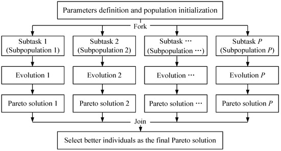 Figure 2 shows a map of the population decomposition process in PMOGA, while the map of the PMOGA algorithm is given in Figure 3. In the PMOGA, the calculation of the original larger population is treated as the parent task. After the initialization step, the divide-and-conquer strategy is used to divide the task into several smaller subpopulations which will be executed simultaneously in different cores or threads. Each computing unit only answers for the task assigned by thread manager, and all the subpopulations start searching for the feasible Pareto solutions. The parallel processing will not be stopped until all subtasks finish the corresponding calculation task. Once the calculation of all subtasks is done, the main thread will collect the final Pareto solutions of all the subpopulations and choose the best individuals to form up the optimal Pareto solution set.